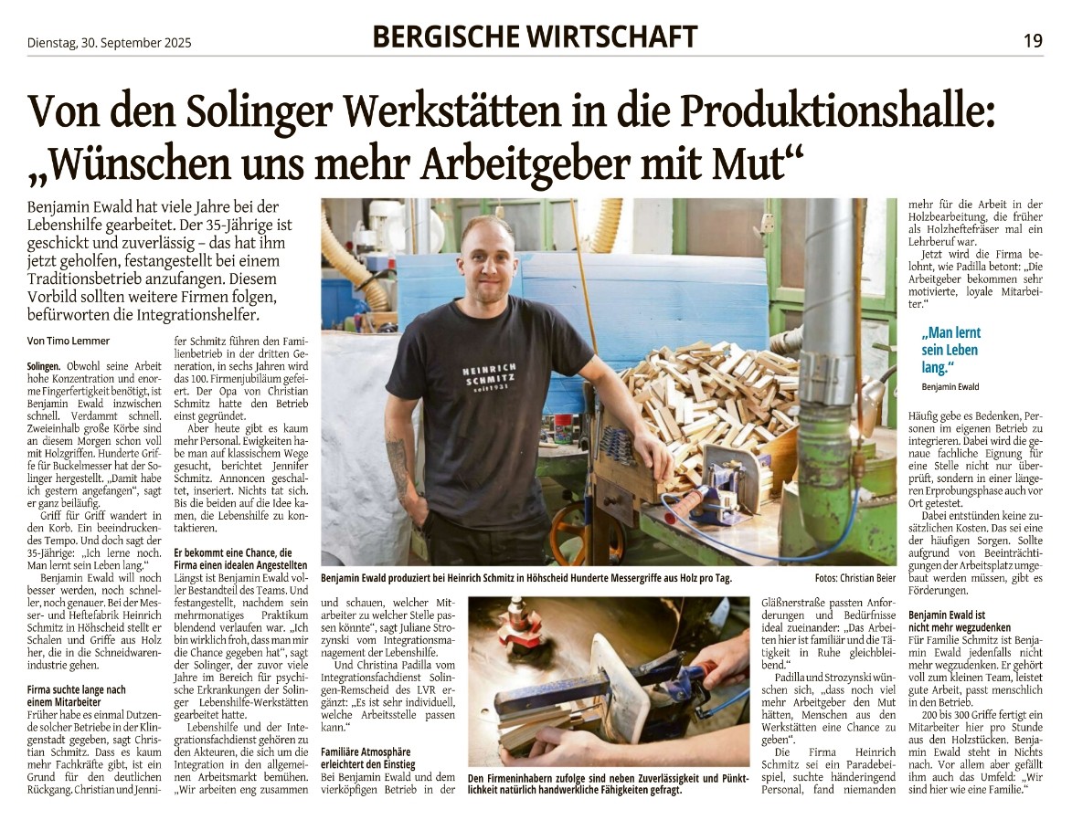 Das Solinger Tageblatt berichtet am 30.09.2025 in einem Artikel von Timo Lemmer über die erfolgreiche Vermittlung eines Werkstatt-Mitarbeiters auf den allgemeinen Arbeitsmarkt (Foto: Christian Beier).